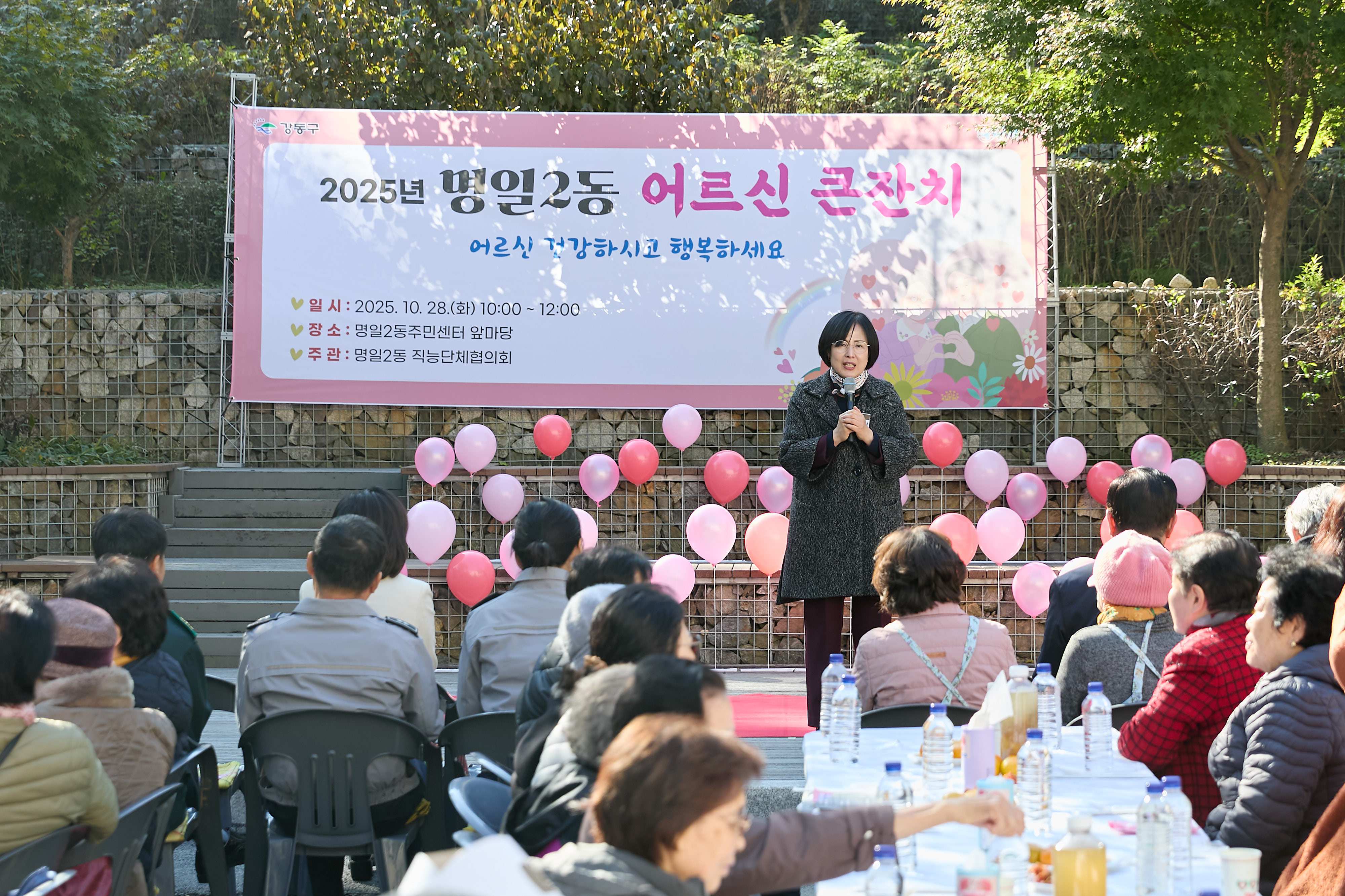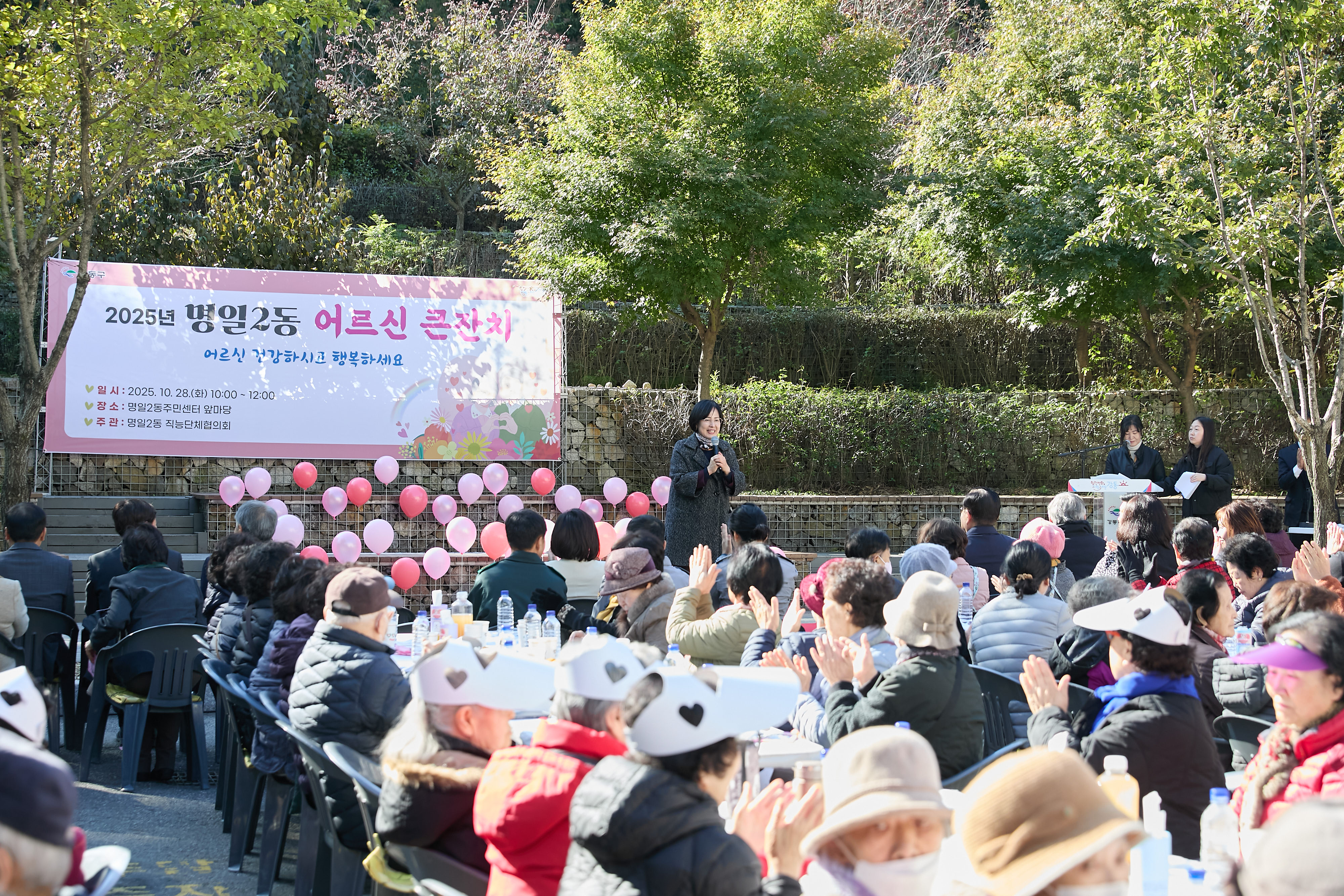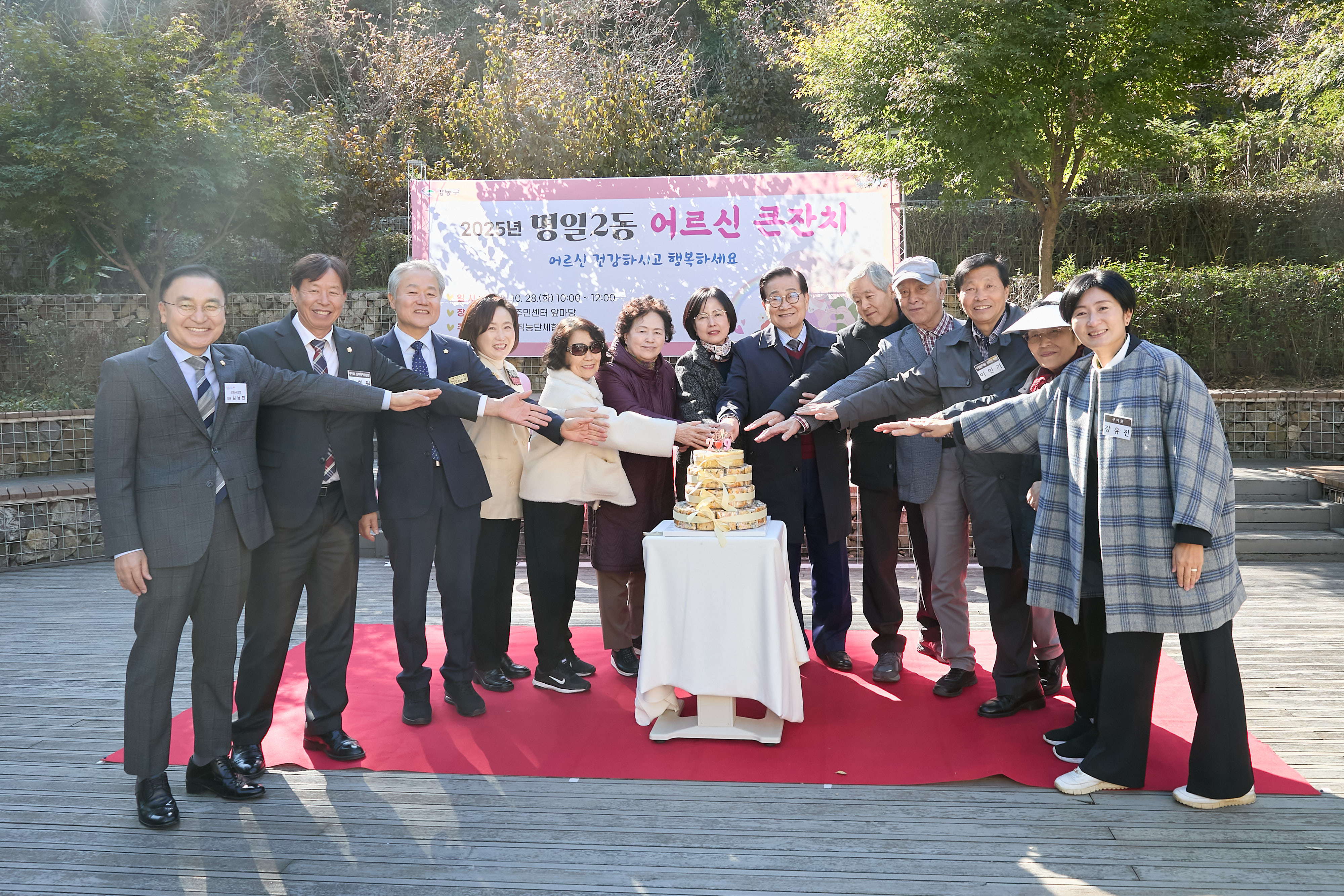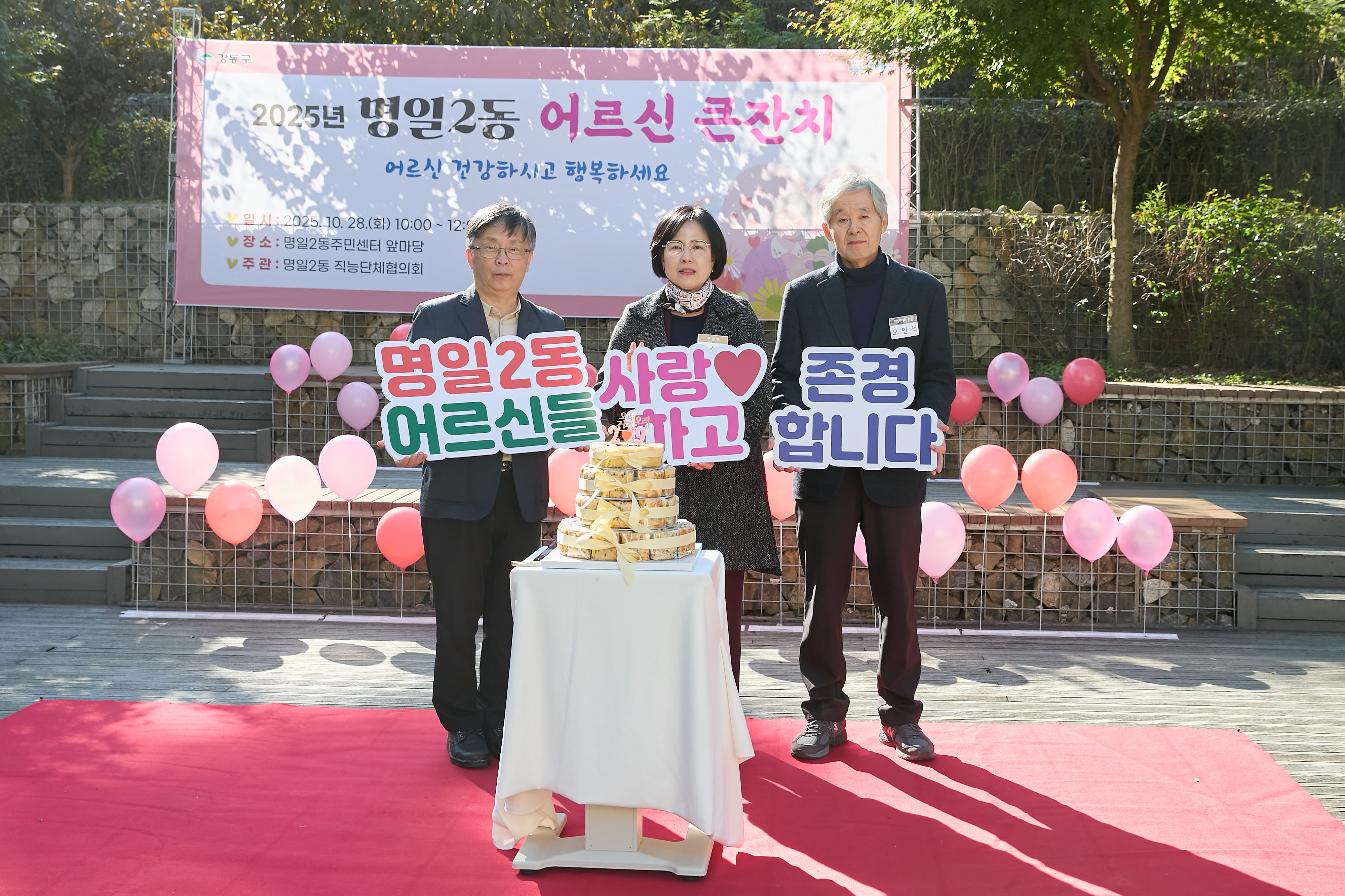10월 경로의 달을 맞아 지난 10월 28일 화요일 명일2동 주민센터 앞마당에서 어르신 큰잔치가 열렸습니다. 식전공연을 시작으로 표창장 수여, 생신축하 노래와 함께 떡케이크 촛불 끄기 등 어르신들을 위한 뜻깊은 자리였습니다. 방문해주신 어르신분들께 다시 한번 감사의 말씀 드립니다. <2025년 어르신 큰잔치> 1. 일시: 2025. 10. 28.(화) 10:00 2. 장소: 명일2동 주민센터 앞마당 3. 내용: 식전공연, 식사제공(자장면, 탕수육, 떡, 과일 등), 표창수여 등 4. 주관: 명일2동 직능단체협의회 | |||